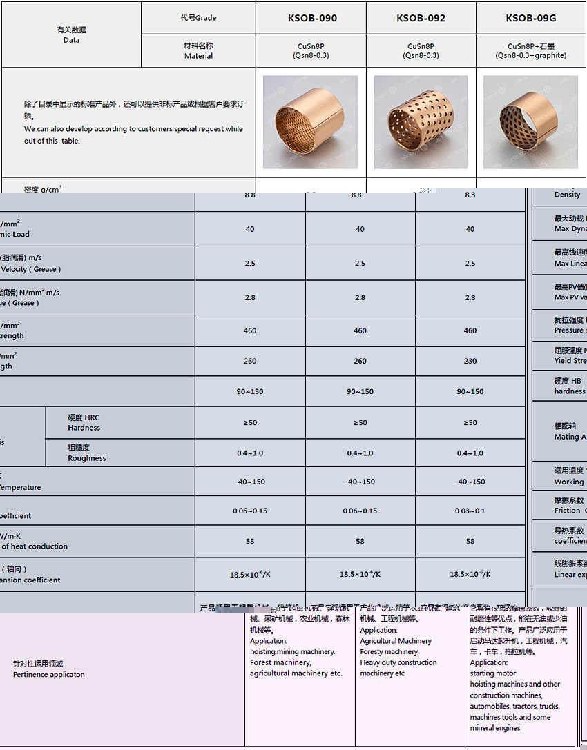 結構特性 以CuSn8 青銅作為基板卷制而成的一種具有高承載、高耐磨的經濟型薄壁銅基卷制軸承。根據不同的潤滑條件,我們可以提供菱形油穴和油孔兩種形式,菱形油穴用于油脂的潤滑,通孔用于流體潤滑,這樣的設計可以確保在軸承運行初期就能建立潤滑油膜,因此可以降低起始摩擦系數。 產品應用 農用機械、建筑機械、起重機、卡車底盤部件、輸送機、升降機、卷揚機、校平機等。 實際運用中根據使用工況的不同,基體可以采用不同牌號的合金,表面可以加工成其他形式的油孔和油槽。產品范圍包括:KSOB-090、KSOB-092、KSOB-09G。